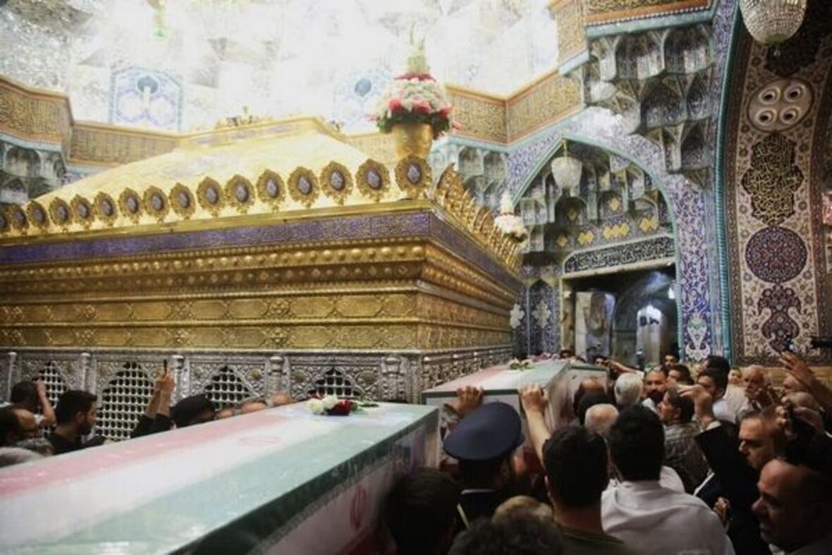 این آیین وداع با حضور پرشور مردم انقلابی قم در حرم مطهر حضرت معصومه (س) با سر دادن شعارهای «الله اکبر» «مرگ بر اسرائیل»، «نه سازش نه تسلیم نبرد با آمریکا»،  «آمریکا هیچ غلطی نمیتواند بکند»، «آمریکا، اسرائیل تو با سلاح جنگی ما سلاح ایمان بجنگ تا بجنگیم»، «ما اهل کوفه نیستیم علی تنها بماند»، «آمریکا شیطان اکبر»، «حزبالله پیروز است اسرائیل نابود است» همراه بود.