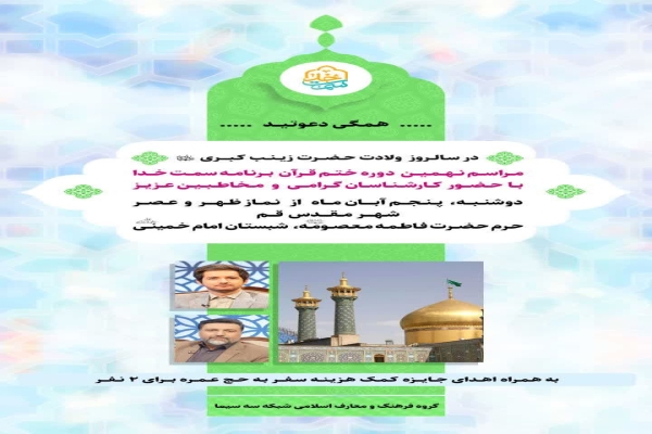 به گزارش ایکنا از قم، همزمان با سالروز ولادت حضرت زینب کبری(س)، مراسم نهمین دوره ختم قرآن برنامه «سمت خدا» با حضور کارشناسان این برنامه و مخاطبان بهصورت پخش زنده از حرم مطهر بانوی کرامت برگزار شد.