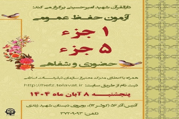 این آزمون در دو بخش یک جز و پنج جزء قرآن کریم دنبال میشود، این آزمون در روز ۸ آبان از ساعت ۱۰ تا ۱۲ ظهر برگزار میشود.